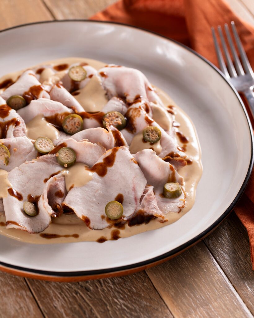 Arista tonnata Introduzione L’arista tonnata è un secondo piatto freddo elegante e saporito, perfetto per pranzi estivi, buffet o occasioni speciali. Tenerissima carne di maiale accompagnata da una salsa al