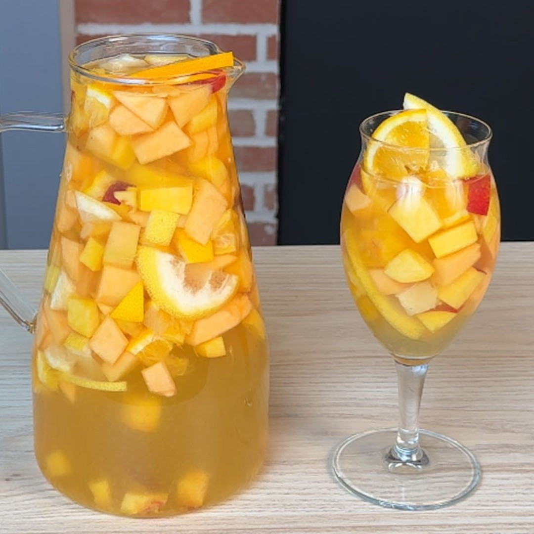 La sangria bianca è una bevanda alcolica deliziosa e fruttata, una variante leggera della tradizionale sangria spagnola, originaria della Catalogna. È perfetta da sorseggiare durante la stagione estiva in occasione di una cena tra amici. Dolce, aromatica e molto rinfrescante, come la versione classica, ha come ingrediente principale il vino, in questo caso bianco anziché rosso. Questo cocktail irresistibile è arricchito da vodka, spezie e tanta frutta fresca, ed è ideale da consumare all’ora dell’aperitivo insieme a quadrotti di tortilla e ad altri stuzzichini salati.