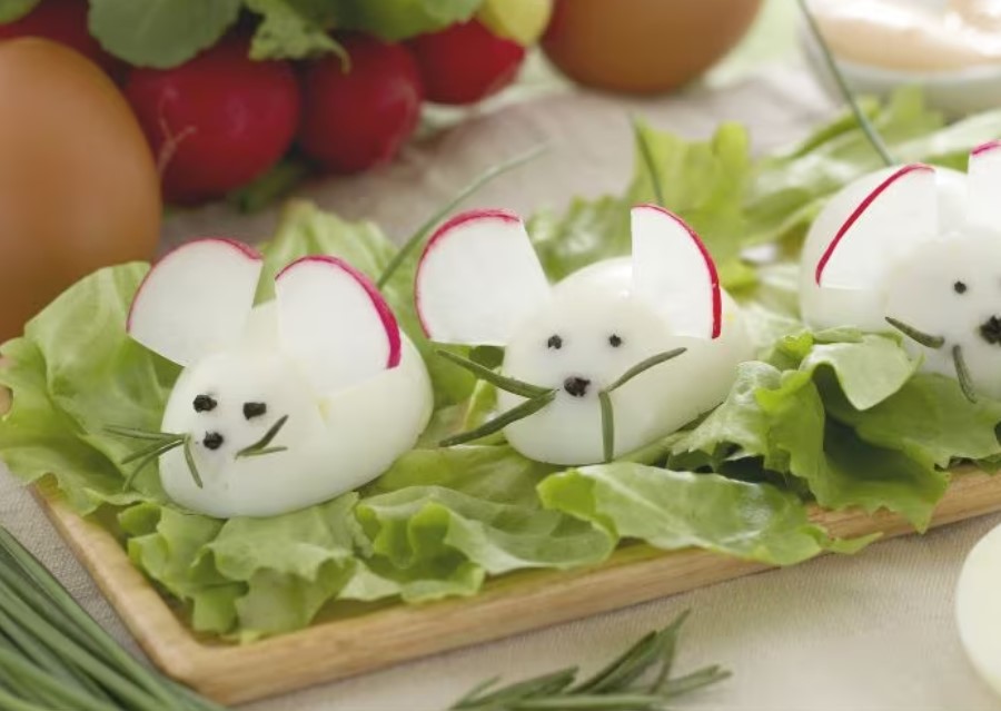 I topolini di uova sono un antipasto simpatico e originale, perfetto per le festività pasquali. Realizzati con uova sode e decorati con ingredienti semplici ma creativi, questi topolini sono ideali per rallegrare la tavola e intrattenere i più piccoli. Le “orecchie” dei topolini sono fatte con ravanelli, gli occhi e il naso con olive nere, mentre rosmarino ed erba cipollina formano i baffi e la coda. Accompagnati da una salsa rosa (maionese e ketchup), sono un’idea semplice e gustosa per la Pasqua.